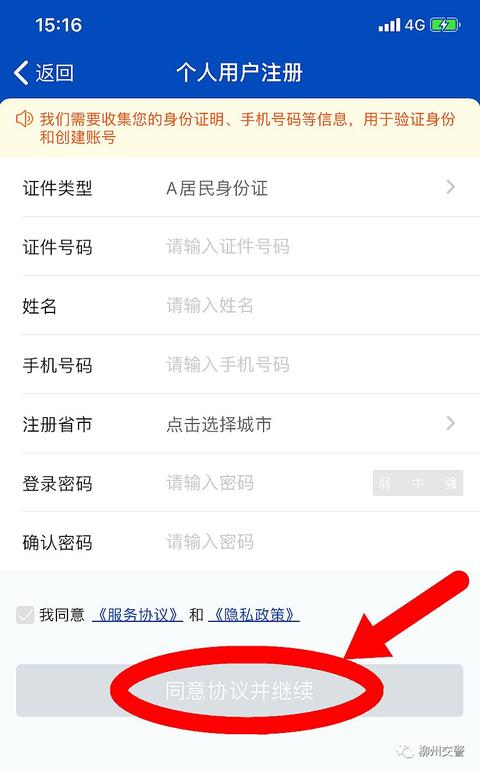下载安装完毕后,初次登录的用户需要进行注册,点击“注册”按钮,注册时,新用户需填写真实有效的个人基本信息(用户姓名、二代身份证号码、手机号码等信息),“√”我同意,点击“同意协议并继续”。如已注册过的用户,输入身份证明号码、输入密码进行登录。