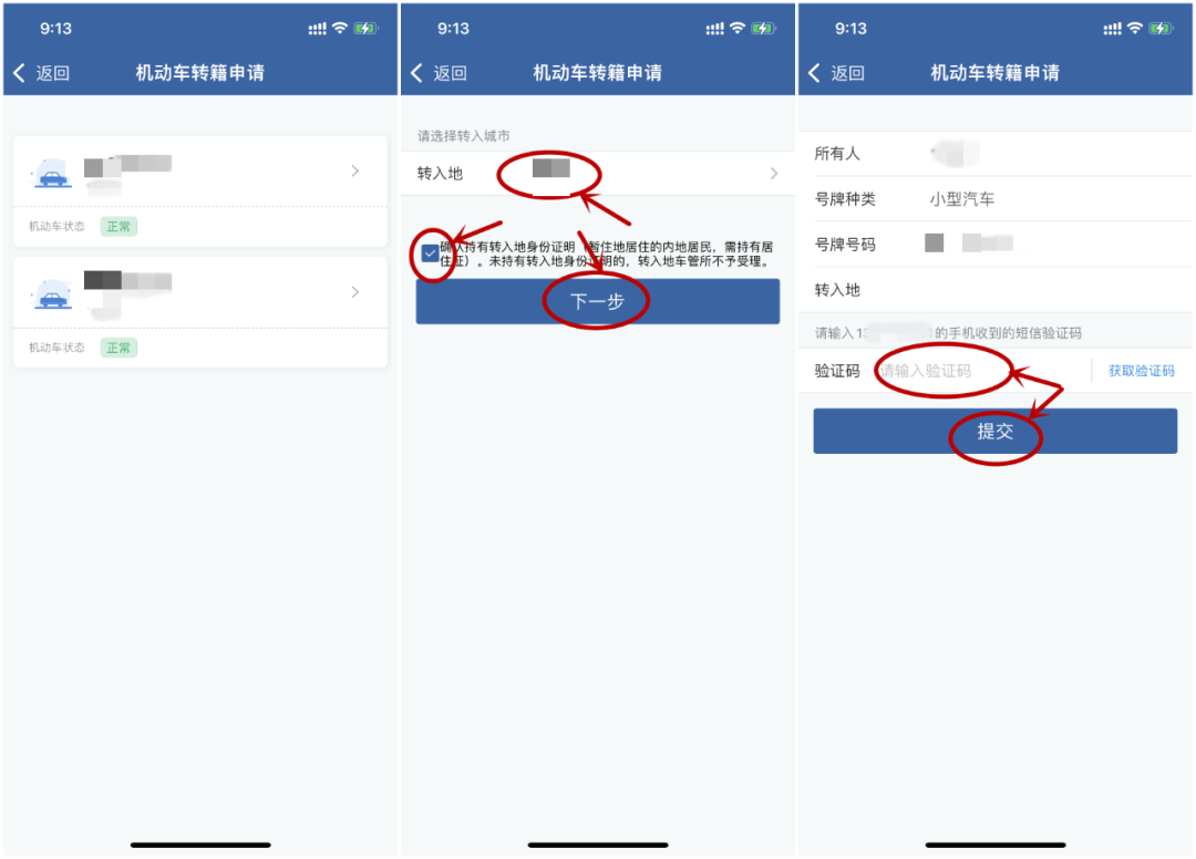 进入确认信息界面,核对所有人、号牌种类、号牌号码、转入地等信息,确认无误后,点击获取验证码,输入短信验证码,点击【提交】按钮,完成机动车转籍申请提交。