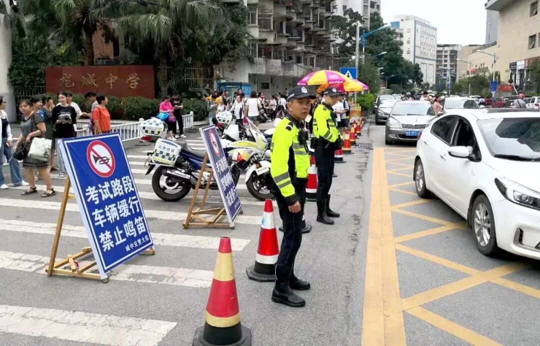 在高考前,各辖区交警大队积极与辖区各参考学校负责人联系、协调,提前对考点周边道路进行调查摸底,对考点周边道路交通设施、标志标线进行全面检查,及时优化调整。在考点路段两端设置“考场路段、禁鸣喇叭、减速慢行”等内容的警示牌,警示过往车辆谨慎通行,严禁鸣喇叭、减少对考场的干扰。