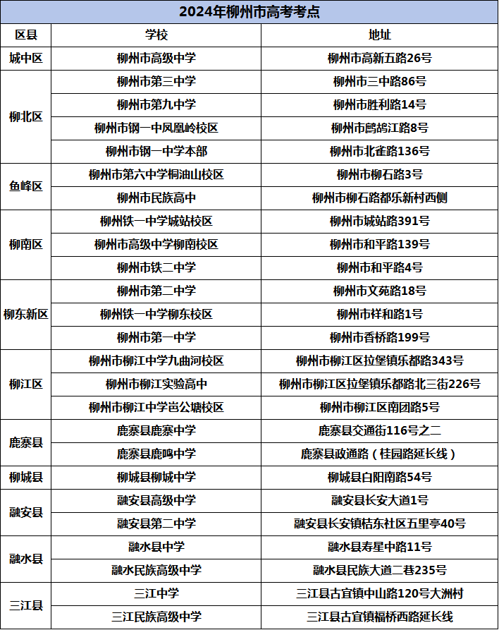 今年高考柳州市城区共设16个考场,其中2个为备用考场;县区设9个考场。
