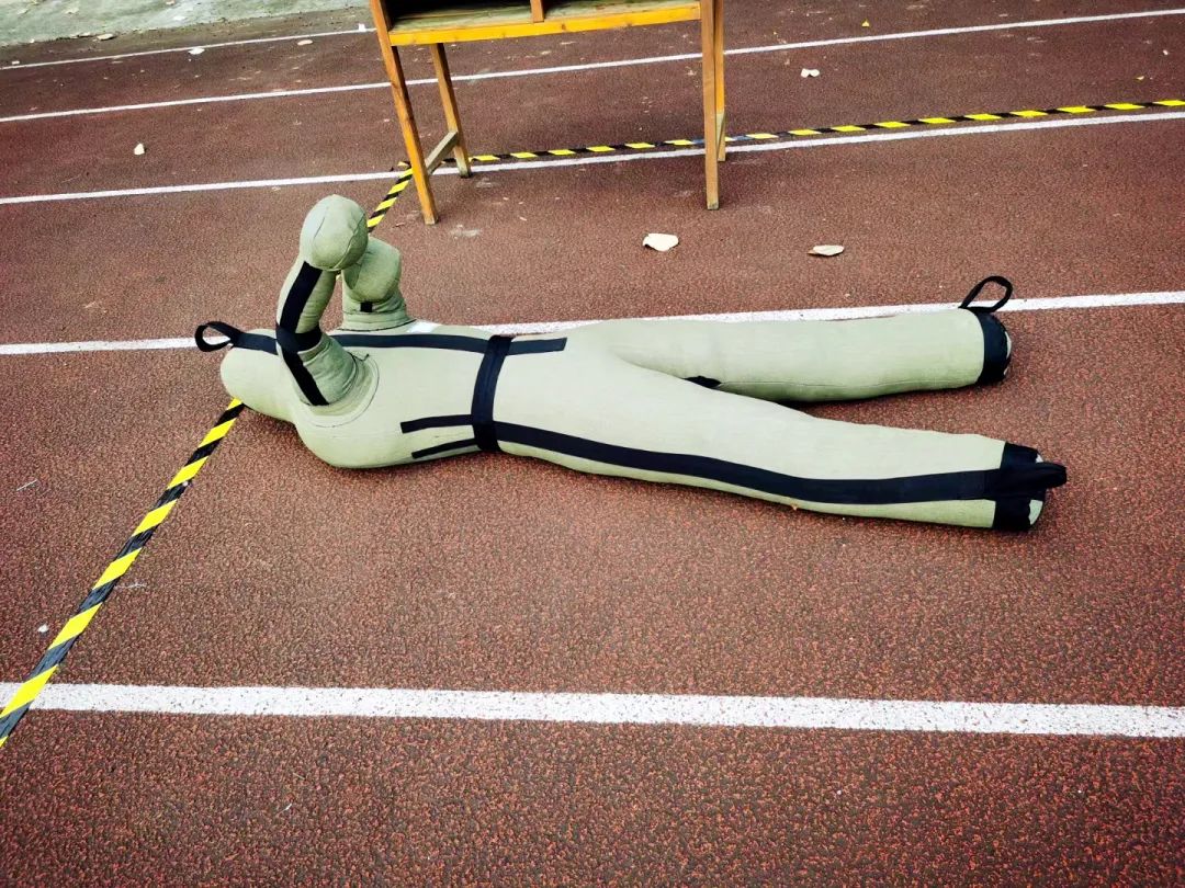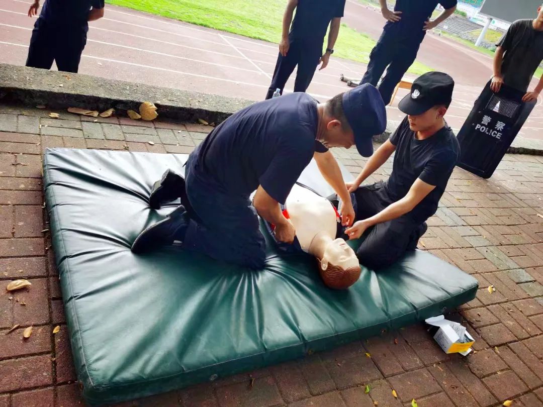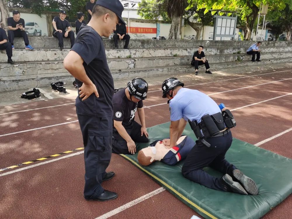 实战综合体技能安排在交通学校400米田径场,在教官组的亲身示范下,参训民警3人一组在400米跑道上,分别完成应急警务急救(心肺复苏)、搬抬伤者、穿过回转弯道、口头制止、使用盾牌撞击和警棍击打、跨越横栏、使用催泪喷射器、5米绕桩、出枪警示、控制上铐带离等一整套实战综合体技能训练考核。