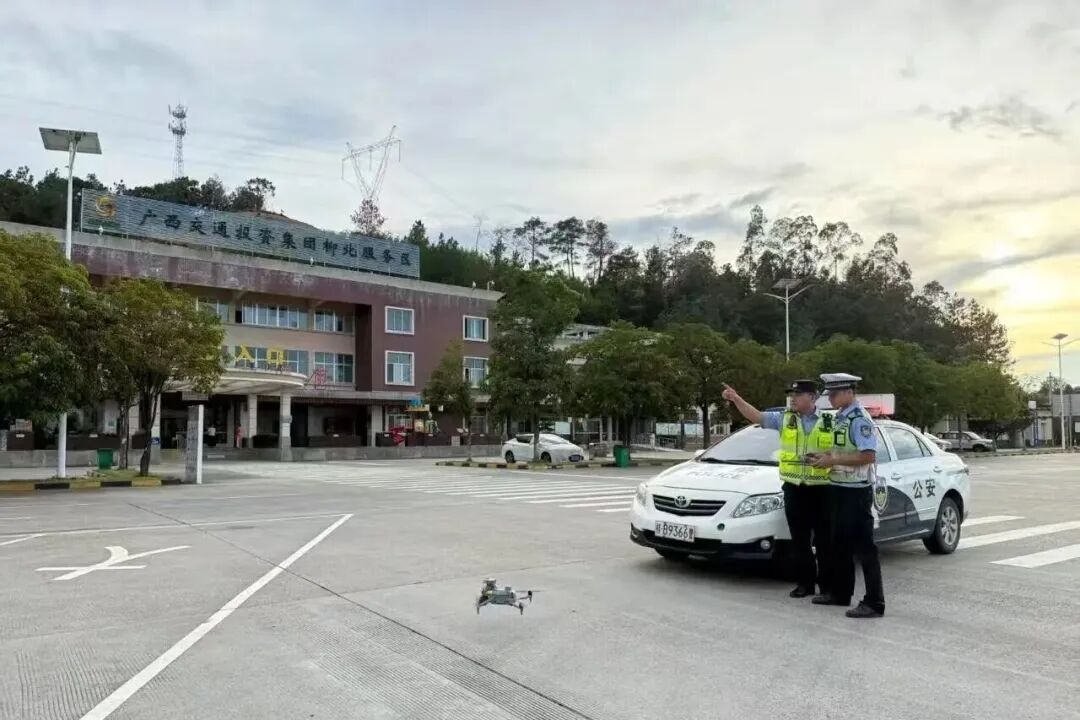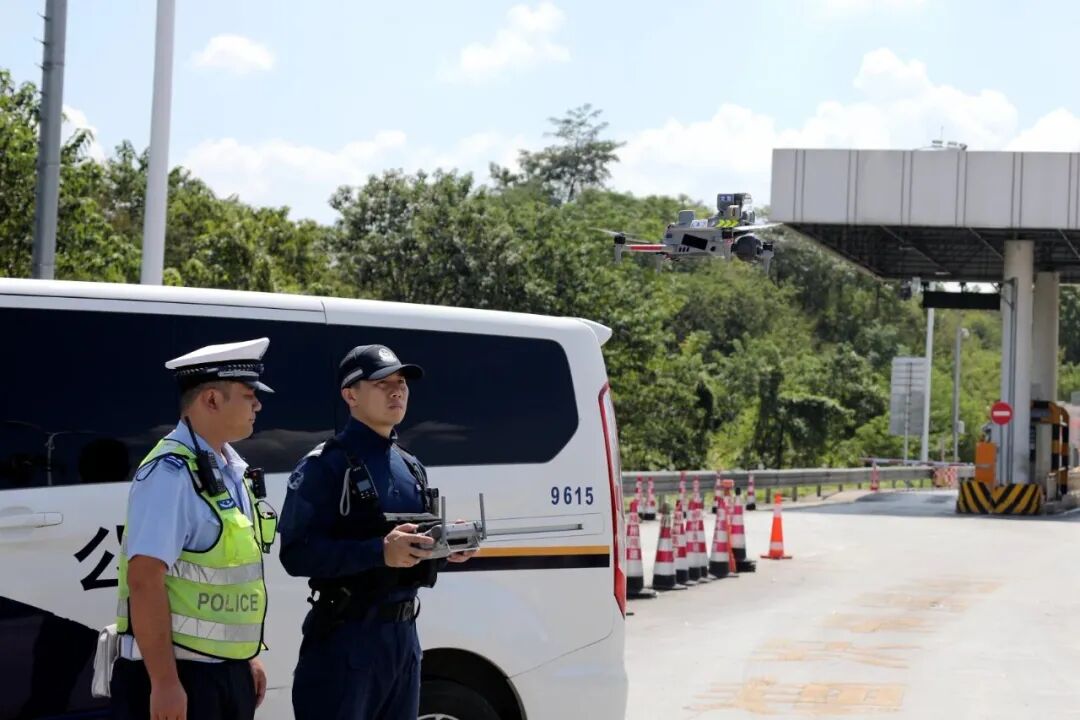 与此同时,在高速路段,无人机也同步驻点起飞、往返巡航,对违规占用应急车道的车辆进行精准抓拍与喊话劝导,有效消除了道路安全隐患。10月4日,巡航的无人机发现一辆面包车违规停靠在高速匝道关键位置,这极大增加了后方车辆追尾风险。飞手立即通过无人机机载高音喇叭与车内驾驶人实时沟通,引导其撤离至护栏外安全区域,同时将故障车位置同步推送至地面警力。仅几分钟,地面交警便抵达现场,疏导车流,推移故障车至安全位置,迅速恢复匝道通行。