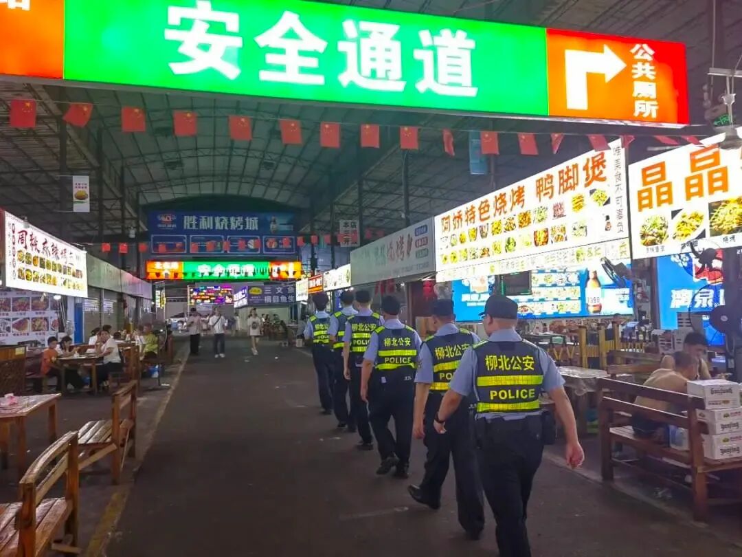 在社会面管控方面,柳州警方坚持“屯警街面、动中备勤”机制,对辖区商圈、公园、烧烤摊等夜间经济活跃场所进行高频次、长时段巡逻,切实提高见警率、管事率,及时发现和消除安全隐患,高效压降事故发生率。作为柳州最火爆的夜市,胜利烧烤城多次“火出圈”,假期期间更是人流暴增。针对宵夜摊、烧烤摊易发生酒后寻衅滋事和噪音扰民警情的特点,9月30日开始,胜利派出所就将警务室前移到夜市核心位置,同时采取“定点值守+动态巡逻”相结合的模式,科学布防,快速响应,实现夜间“不打烊”,全力守护辖区群众安居乐业。