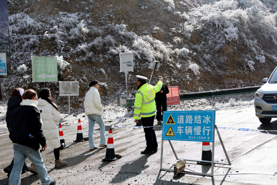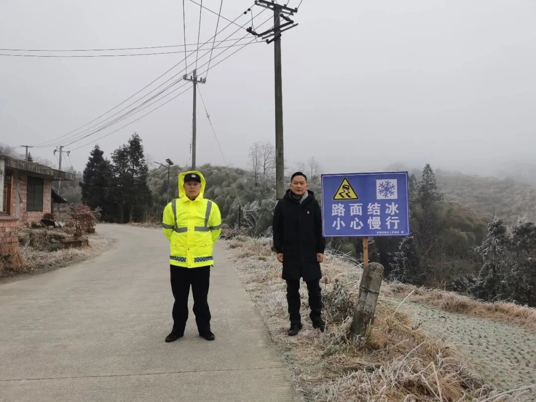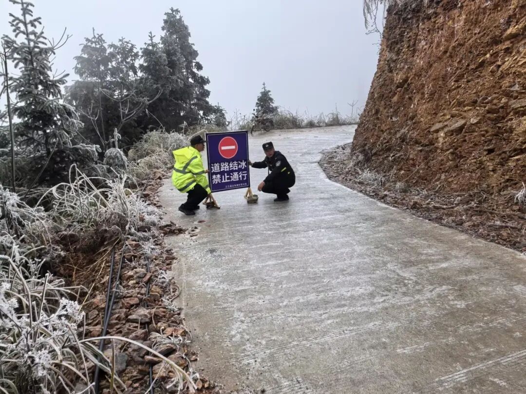 同时,两地交管大队统一调度,联合辖区派出所、乡镇村委等力量,加强重点路段巡逻防范:在易结冰路段设置“减速慢行”警示标牌;对已结冰影响通行路段,立即放置“禁止通行”警示牌并拉设警戒带封闭道路,坚决阻断风险。