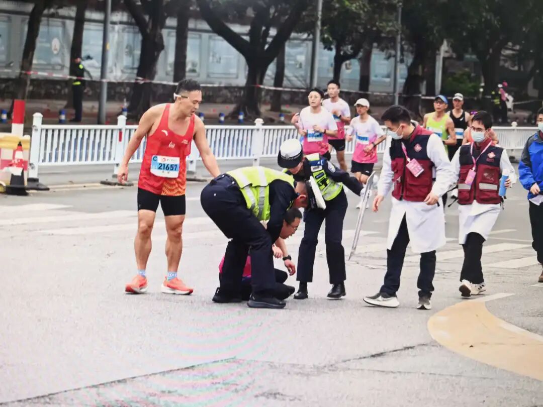 “放轻松,深呼吸,我扶着你,医护人员马上就到。”赛道上,一名跑者因体力不支,脚步踉跄,几欲摔倒。执勤民警见状迅速上前,稳稳将其扶住,一边轻声安抚,一边呼叫现场医护人员。片刻间,医护人员赶到现场,民警配合医护人员将跑者搀扶至救护车上休息,确认其身体无碍后才放心返回岗位继续执勤。