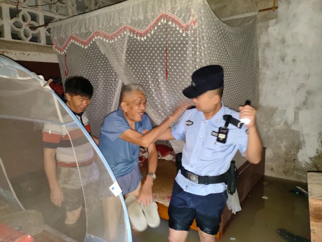 6月18日凌晨4时,柳江区百朋镇新圩场居民区十几户人家的一楼被水淹没,多人被困楼上。百朋派出所民警辅警在救助过程中,一位群众反映其邻居韦大爷今年90岁,腿脚不灵便且子女均在外务工,一人独居,其家靠近河边堤坝低洼路段,水位上涨迅速。民警当机立断,迅速蹚水进入老人房中并大声呼叫,在房子最深处找到被困老人,将其救出。