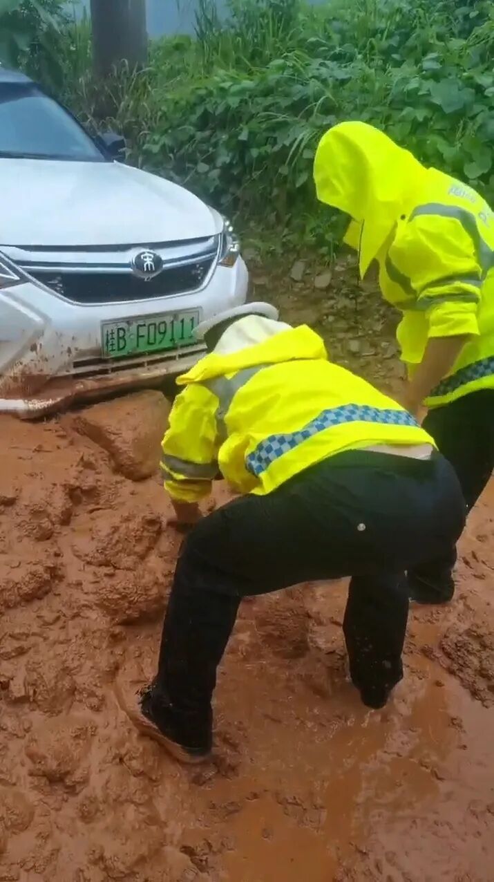 6月17日10时,融水苗族自治县大浪镇板大线国道上道路塌方,车主粟先生驾驶小轿车行驶至该路段时,车辆被陷在泥潭里,人车被困,情况危急。大浪派出所民辅警火速赶到现场,快速设置安全警示,提示引导过往车辆紧急避险,疏导交通。确保安全后,民警辅警冒雨进到泥潭中徒手清理障碍,并及时联系救援车辆,进行施救。经1个多小时努力奋战,成功救出群众及被困车辆。