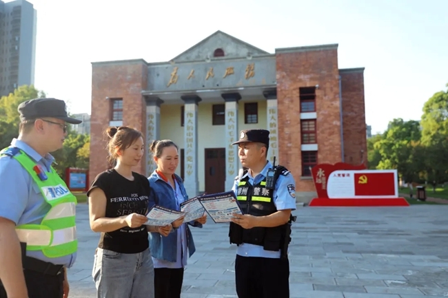 作为军事博物园所在社区的负责民警,每天开馆前,银山派出所民警夏明洪都会带领辅警和义警队员在园区巡逻,检查各项安全措施,排查隐患风险。开馆后,夏明洪会根据实时人流,及时疏导交通,并为游客做好指引和安全保障服务,积极响应各类求助,及时化解游客的矛盾纠纷。