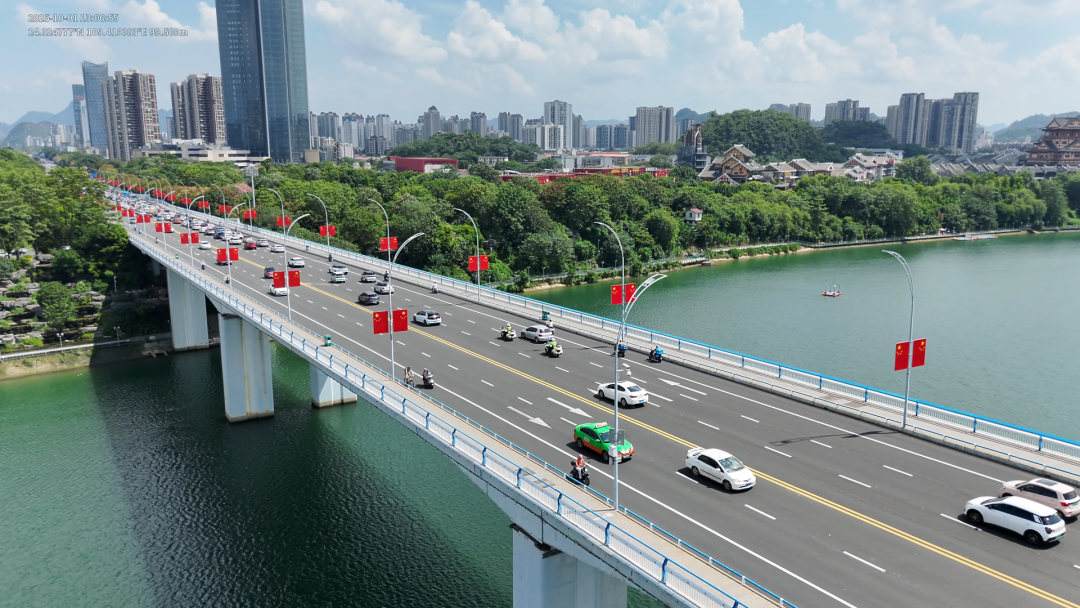 “各位市民、游客朋友们,欢迎来到美丽的柳州……请大家有序通行,祝大家旅途愉快!”清脆的提示声在空中回荡。大家循声望去,看到一架架无人机在文昌大桥上空盘旋。这些“空中交警”和地面铁骑队员默契配合,织密了“科技+人力”的双重防护网,成为节日里最独特的风景线。