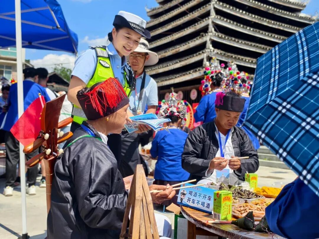 三江侗族自治县的鼓楼前,身着侗族盛服的乐手一边弹奏琵琶,一边哼唱歌曲;身着“荧光绿”马甲的民辅警们手持交通安全提示牌和宣传册,围坐在乐手身边。这特殊的一幕吸引了来往人群的注意,不少人好奇地停下脚步,上前观看。这是侗族“多耶节”上的动人一幕,却只是柳州公安安全宣传工作的一个缩影。假期期间,民辅警们深入基层,走近群众身边,将安全宣传融入地域特色,让安全知识“看得见、听得到、记得住”。