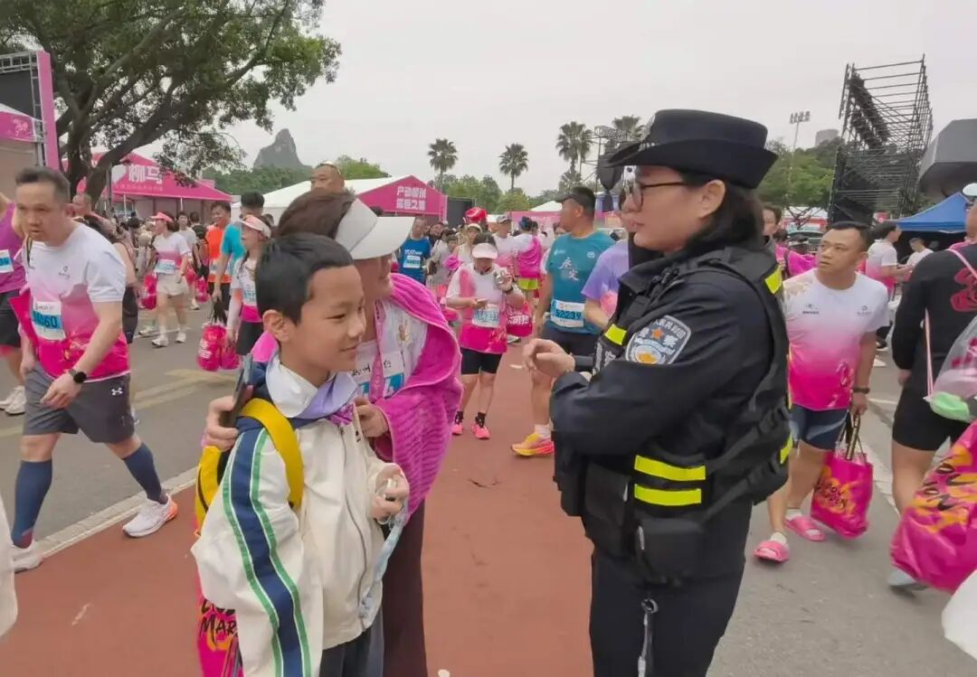 赛事现场,暖心的故事也在悄然发生。“警察姐姐,我和妈妈走散了。”终点处,一个小男孩神色慌张地跑到正在执勤的民警身边。原来,小男孩在人群中找不见妈妈,独自一人不知所措。民警蹲下身子,轻声安抚:“别怕,姐姐帮你找妈妈。”她耐心询问孩子母亲的联系方式,迅速拨通电话,并带领小男孩前往汇合地点。见到孩子,母亲内心激动不已,连连道谢:“太感谢了,要不是你们,我真不知道该怎么办!”