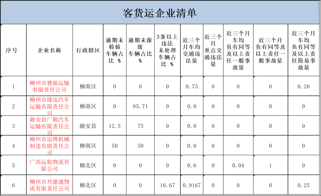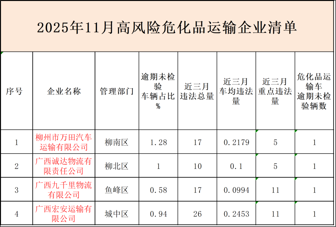 发布日期:2026-01-05 10:35 来源:柳州市公安局交通管理支队为深入推进2026年全市道路交通事故预防工作,进一步抓好危险化学品运输车辆、客货运车辆及驾驶人交通安全管理,有效预防和减少重特大道路交通事故,柳州交警持续开展“五大曝光”行动。根据大数据分析研判平台预警,现柳州交警对高风险危化品运输企业及高风险客货运企业进行曝光。