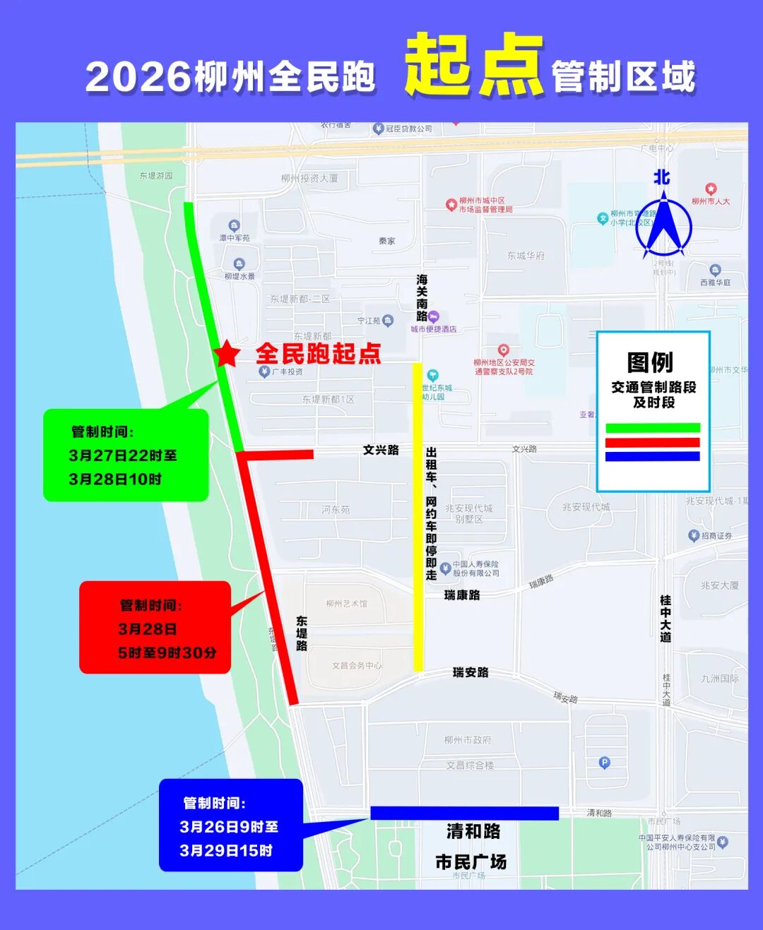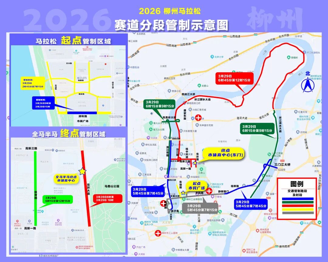 2026年3月28、29日比赛当日,除持有2026柳州全民跑及柳州马拉松赛赛事相关通行证的车辆外,禁止机动车、非机动车于管制时间内在以下道路通行,同时与管制道路相交的路口严禁一切车辆、行人通行。具体管制措施分为起终点管制区域和赛道分时、分段管制。