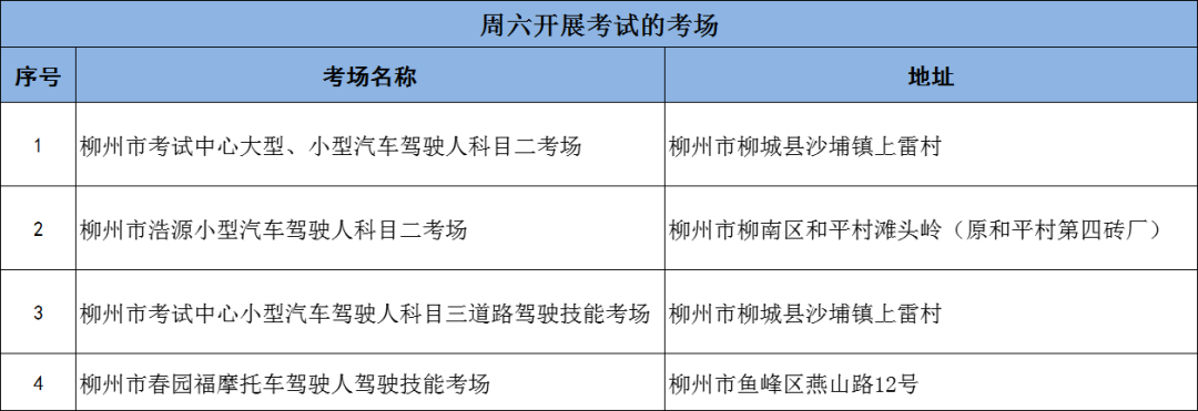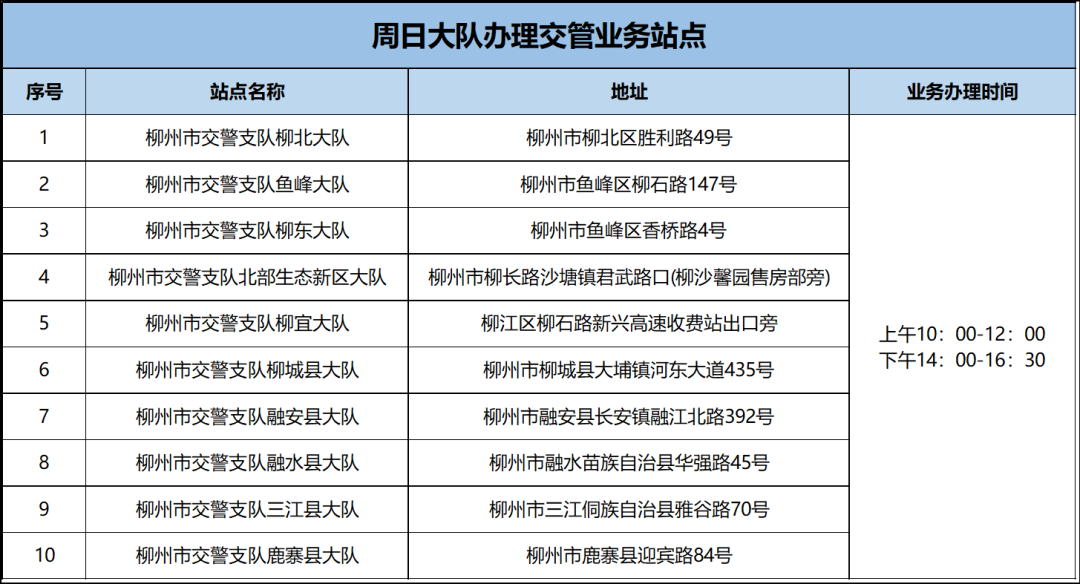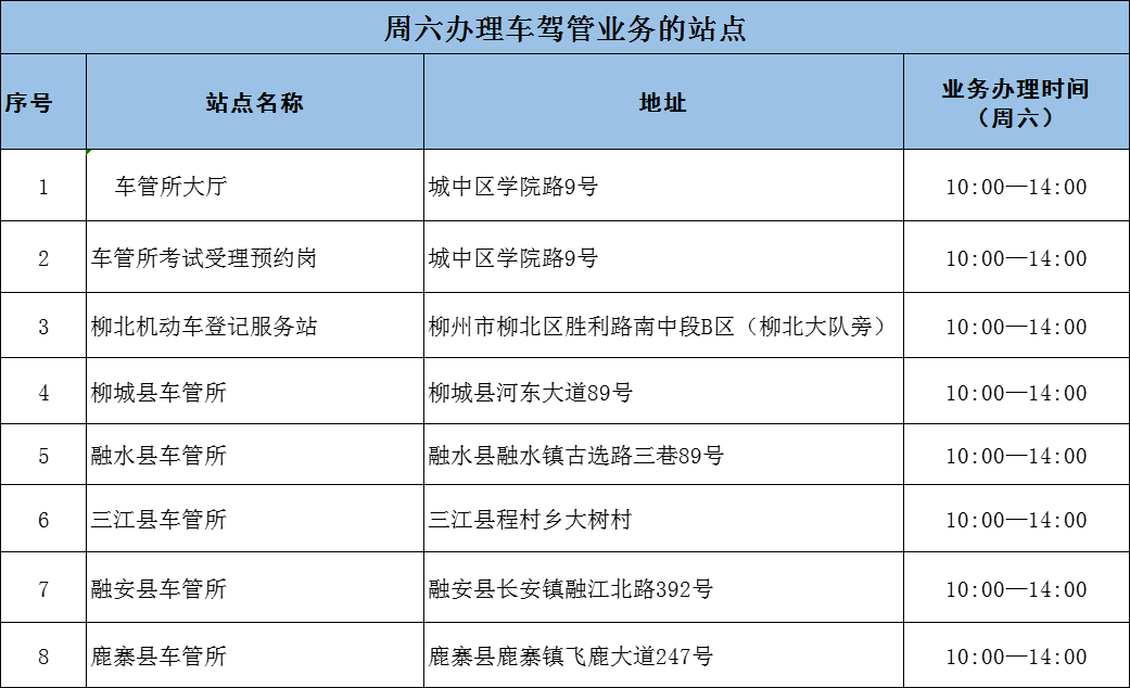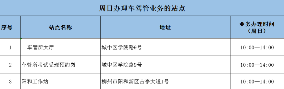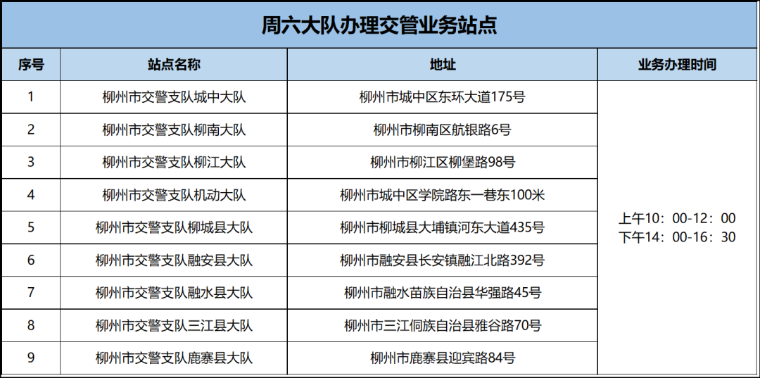 本周六(6月29日)9个大队、车管所大厅、车管所考试受理预约岗、柳北机动车登记服务站、五县车管所及26家机动车安检机构提供各类交管业务办理服务,4家考场开展考试工作。