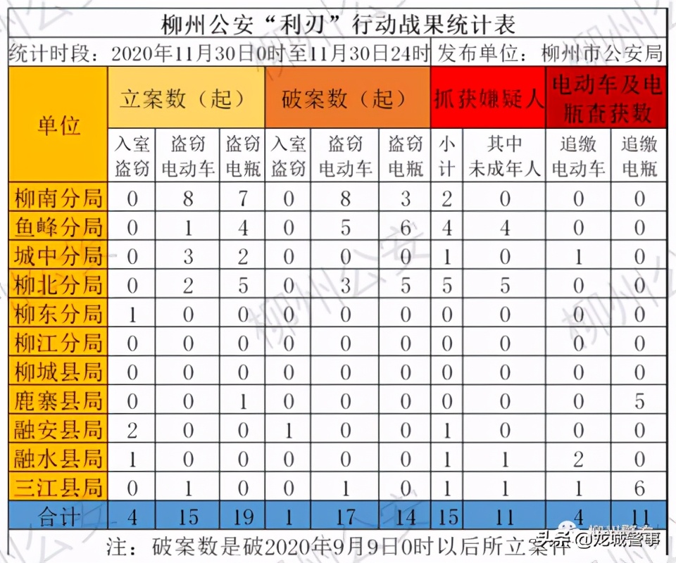 从即日起至12月31日,柳州公安在全市范围内开展为期4个月的打击入室盗窃和盗窃电动车及电瓶违法犯罪“利刃”专项行动。在“利刃”专项行动期间,力争全市入室盗窃、盗窃“两电”案件实现“朝发夕破”“夕发朝破”,打击一切销赃渠道,对违法犯罪分子一律顶格处理。同时,从2020年9月22日开始,每日通过市公安局门户网站、公安微信、微博,向社会发布一次柳州公安“利刃”行动战果统计表,保障市民群众知情权、监督权,引导社会各界广泛参与 “平安柳州”建设。