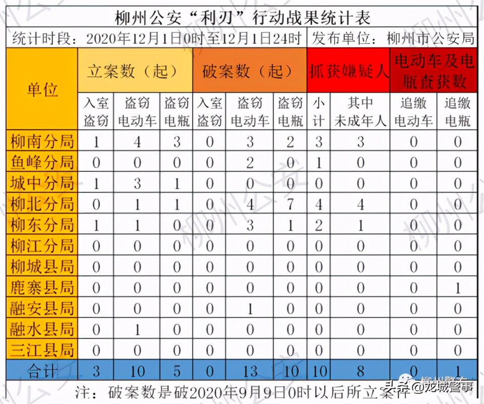 从即日起至12月31日,柳州公安在全市范围内开展为期4个月的打击入室盗窃和盗窃电动车及电瓶违法犯罪“利刃”专项行动。在“利刃”专项行动期间,力争全市入室盗窃、盗窃“两电”案件实现“朝发夕破”“夕发朝破”,打击一切销赃渠道,对违法犯罪分子一律顶格处理。同时,从2020年9月22日开始,每日通过市公安局门户网站、公安微信、微博,向社会发布一次柳州公安“利刃”行动战果统计表,保障市民群众知情权、监督权,引导社会各界广泛参与 “平安柳州”建设。