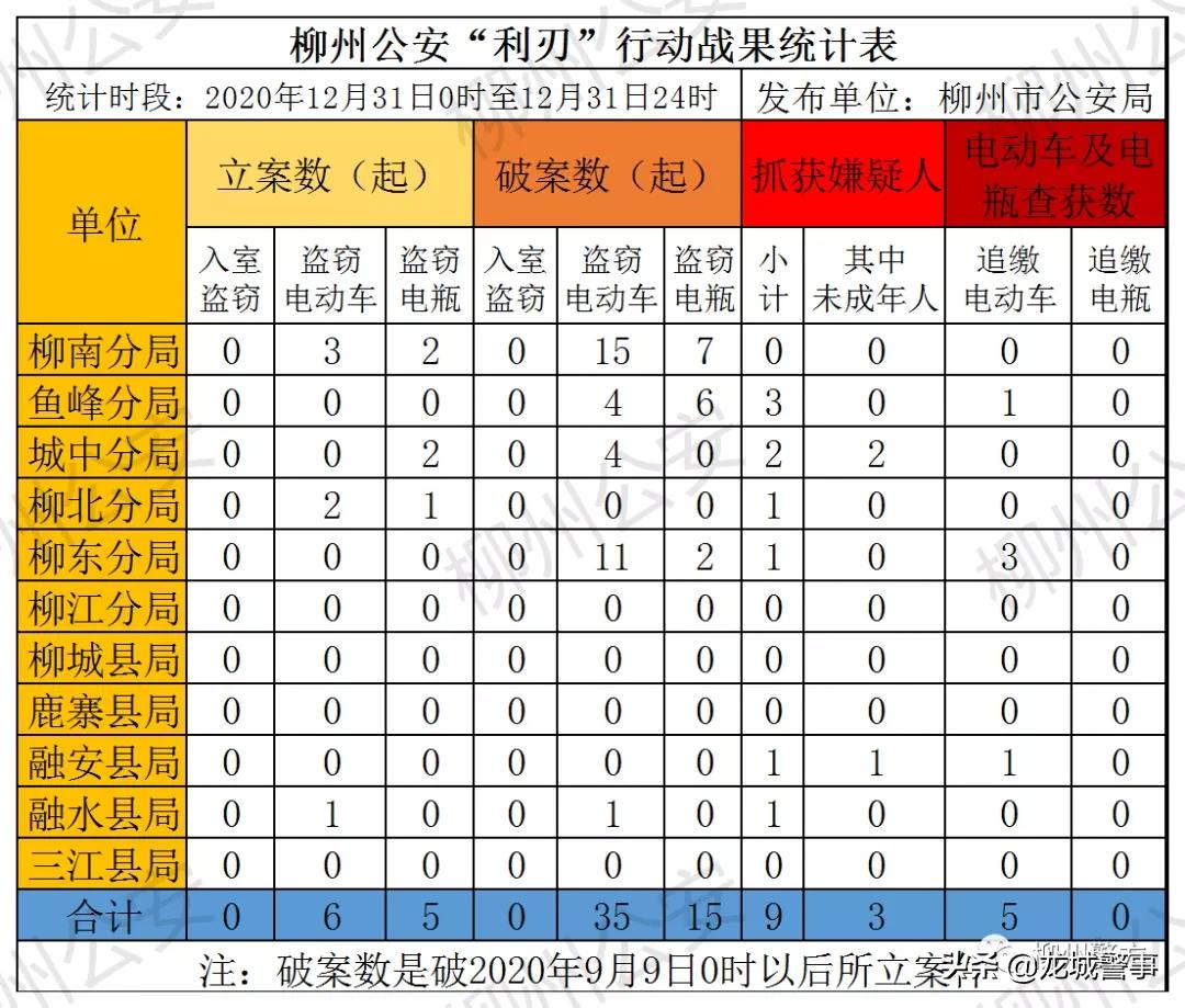 从即日起至12月31日,柳州公安在全市范围内开展为期4个月的打击入室盗窃和盗窃电动车及电瓶违法犯罪“利刃”专项行动。在“利刃”专项行动期间,力争全市入室盗窃、盗窃“两电”案件实现“朝发夕破”“夕发朝破”,打击一切销赃渠道,对违法犯罪分子一律顶格处理。同时,从2020年9月22日开始,每日通过市公安局门户网站、公安微信、微博,向社会发布一次柳州公安“利刃”行动战果统计表,保障市民群众知情权、监督权,引导社会各界广泛参与 “平安柳州”建设。
