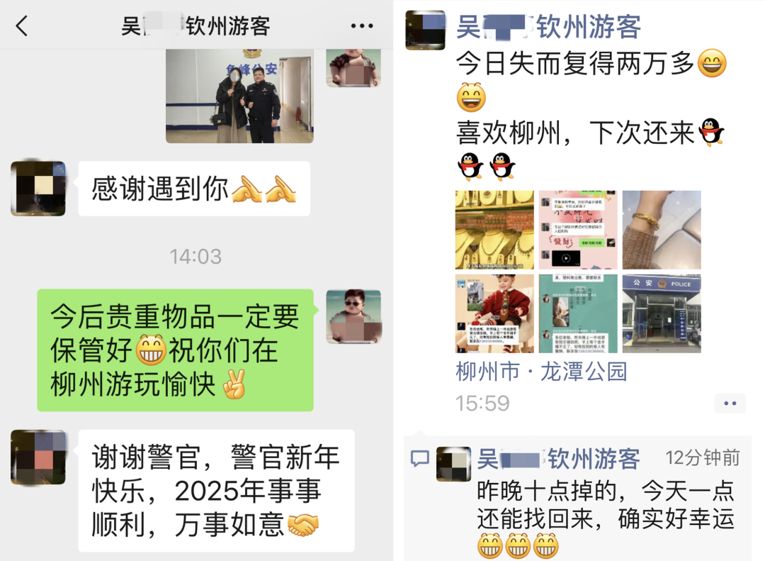 窑埠古镇作为热门旅游打卡地,节假日单日客流量突破万人次,游客遗失财物、孩童走失的情况也时常发生。2025年2月,外地游客吴女士在古镇游玩时,不慎将价值2万多元的金手镯遗失,焦急万分地向覃爽求助。覃爽一边安抚吴女士情绪,一边快速联动安保人员调取周边监控,并将遗失物品信息发到商户义警群征集线索。仅几分钟后,就有商户联系覃爽称发现了手镯并主动送到了派出所。吴女士拿到失而复得的手镯后深受感动,对覃爽表达真挚感谢,并在朋友圈发文:“两万多元失而复得,我爱柳州,下次还来!”