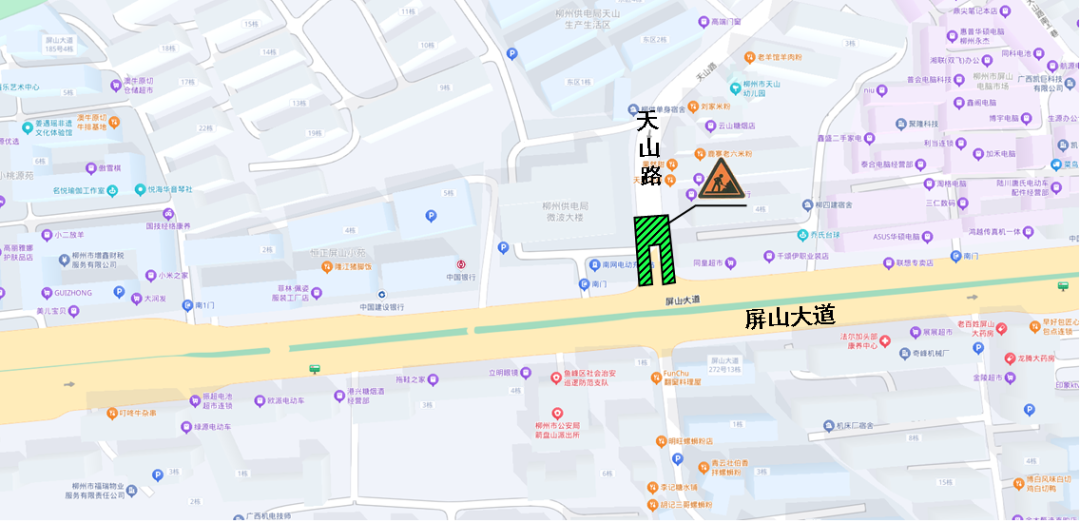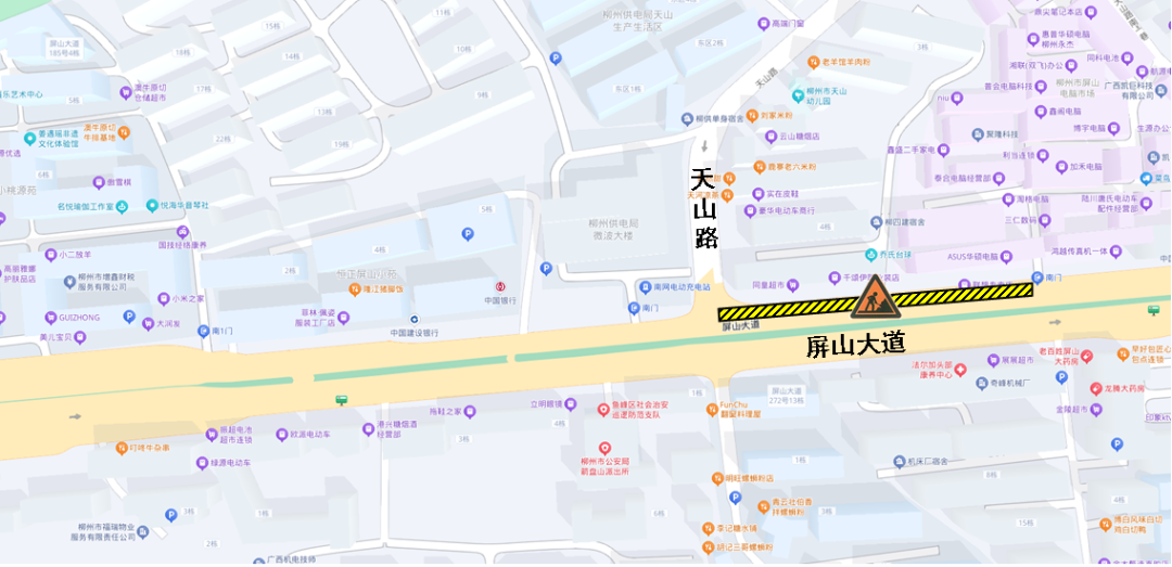 施工地点:柳石路(心怡山水苑小区北侧至橡胶厂宿舍南侧段)实行占道施工。施工期间,柳石路北往南非机动车需借用人行道通行。