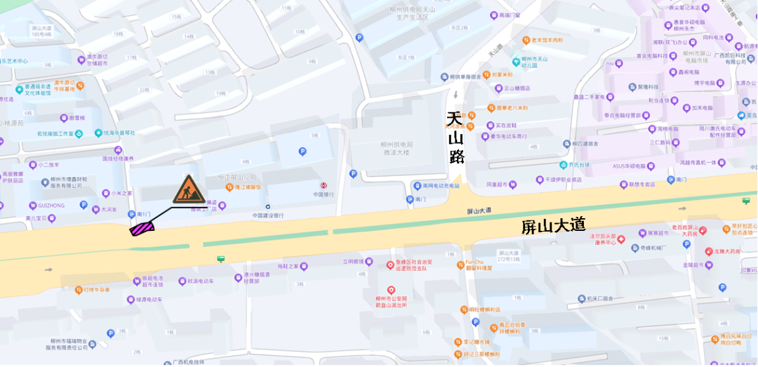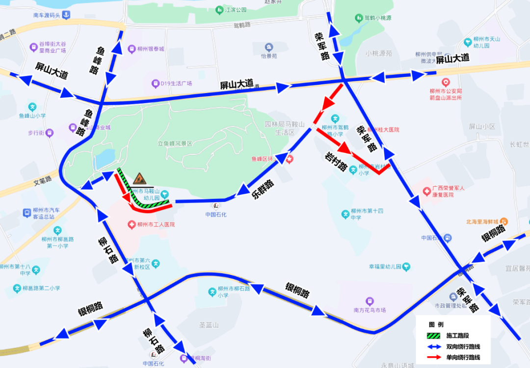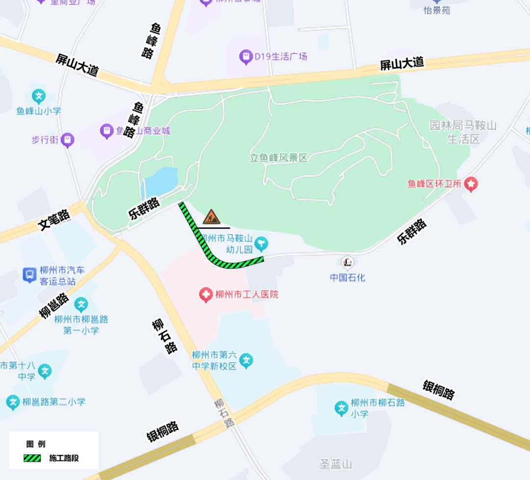 施工地点:乐群路(马鞍山与乐群路路口至柳州市人防办宿舍区段)实行半封闭占道施工。施工期间,乐群路(马鞍山与乐群路路口至柳州市人防办宿舍区段)实行南往北方向的单向交通,北往南方向车辆需改道通行。